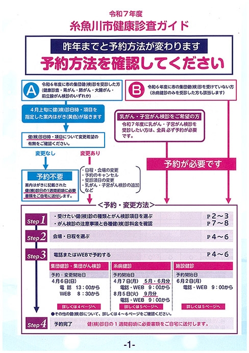 「令和7年度糸魚川市健康診査ガイド」を3月下旬に全戸配布していますので、確認しましょう。