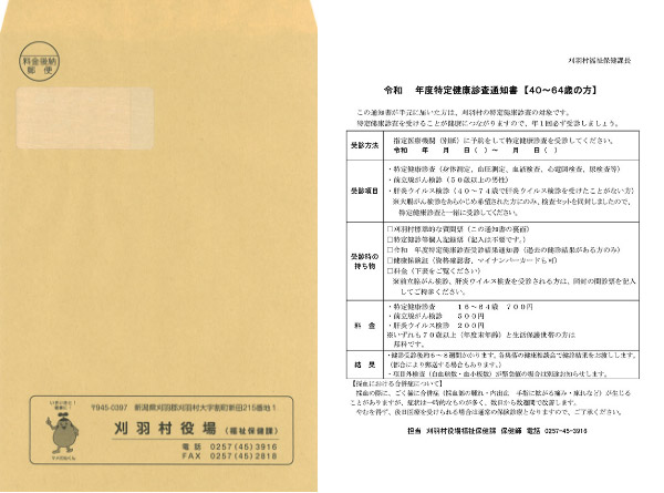 ※送付した受診案内の中に指定医療機関一覧を同封しています。●「刈羽村の特定健診(集団健診)」を希望される方は、事前に福祉保健課にお申込みください。
